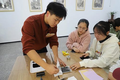 为将非遗传承融入高校美育体系,系列活动中,第二场活动走进安徽省中华优秀传统文化徽派版画传承基地,以“对话非遗”为主题开展艺术导赏与实践体验。活动打破专业壁垒,吸引不同学科同学参与,让古老非遗艺术与青春力量碰撞。