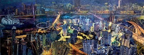 感谢杨教授从跨学科视角对展览的深刻解读,其提及的“景观社会”与“都市奇观”,恰与我创作“再景观”系列的初心相契合。我笔下的重庆,是嘉陵江与长江的褶皱里生长出的立体诗篇。当我的画笔触及《渝城图》的肌理,并非追求简单的城市景观的再现,而是以刮刀与油彩剖开时代的剖面——让棒棒军的汗渍渗透石板街巷,让老茶馆的盖碗茶气息飘向摩天楼群,使每个驻足者都能在像素化的城市肌理中,触摸到历史的记忆与身份的归属。