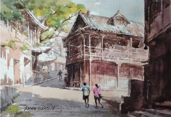纸白如雪,笔落难悔。构图之初,便需慧眼抉择,眼前天地景色何为生发之精粹,何为舍弃之静谧。一处不假思索的铺设,即可颠覆色彩的平衡;一处位置模糊的形状,便使整幅作品失其灵魂。芙蓉镇鳞次栉比的墙头,凤凰层层叠嶂的青瓦,若不分主次,只知一味填充细节,水痕便成为互相干扰的浑浊线条。是故画面节奏布局如同棋局,输赢尽在微末取舍之间;笔法点线则似炼金,珍贵常在概括浓缩之处。正是这艰难的减法,守护了水彩的明净与空间纵深。