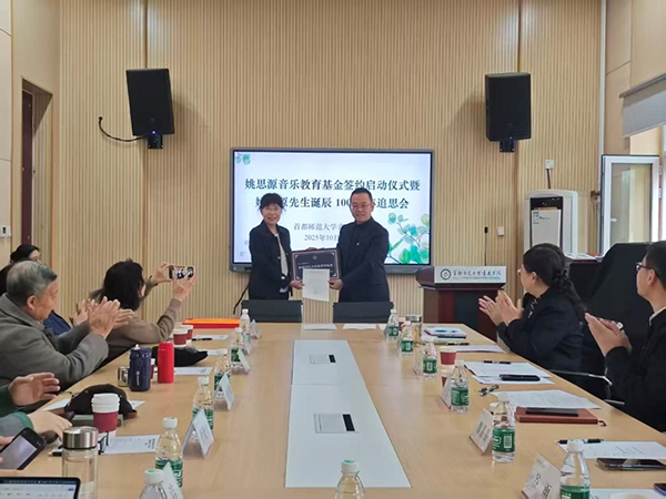 本网讯,10月30日,首都师范大学音乐学院举办“姚思源音乐教育基金签约启动仪式暨姚思源先生诞辰100周年追思会”。姚思源先生亲属姚恒瓈女士,首都师范大学党委常委、副校长宋军,校友工作办公室副主任魏晶晶,音乐系原主任王安国教授,音乐学院原副院长杜晓十教授,北京师范大学教育学部王懿颖教授,首都师范大学音乐学院党委书记李晓东,副院长蔡梦教授,党委副书记杜超及师生代表,有关媒体嘉宾等出席会议,共同见证承载着姚思源先生教育理想与仁爱善举的基金启航,并深切追思这位新中国音乐教育的重要奠基人。会议由李晓东主持。